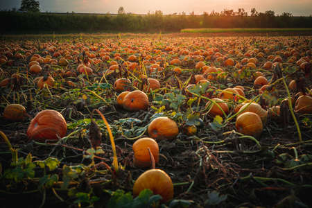 Ripe orange pumpkins on a pumpkin patch at sunset in autumn
