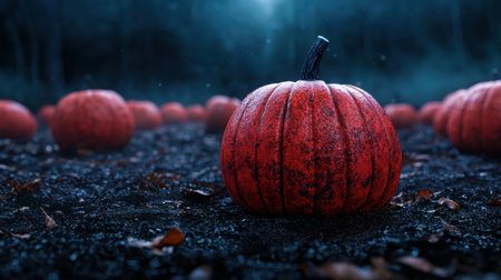 Pumpkin patch dark moody field. Halloween pumpkins on a farm. Organic vegetable farming in Autumn during Thanksgiving time. Harvest season in October.