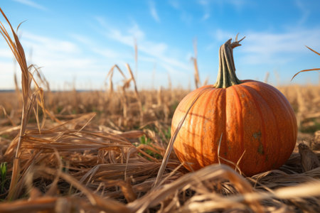 close-up of a single pumpkin in a vast field, created with generative ai