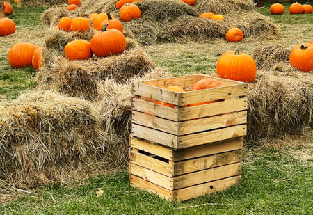 A rustic fall still life featuring a wooden crate full of pumpkins sitting on a strawbale with pumpkins sitting next to it against a blurred background of a grassy field.