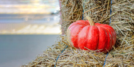 Big pumpkin on the hay on the field. Autumn Halloween Thanksgiving background. Copy space.