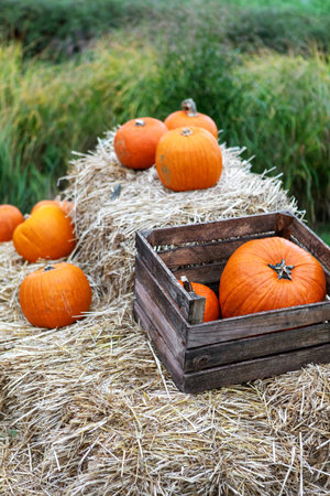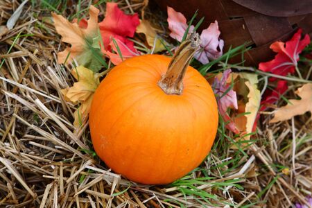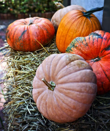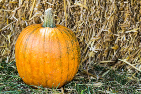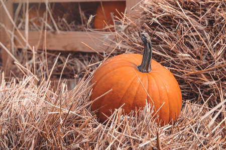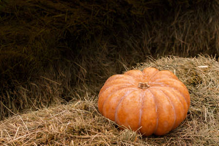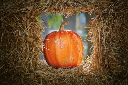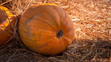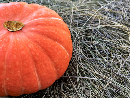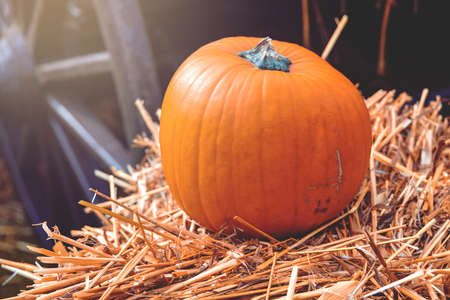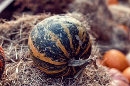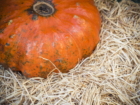 Harvest ripe pumpkin, decorations for halloween pumpkin in the hay.