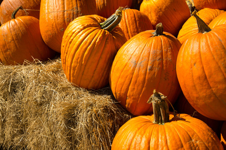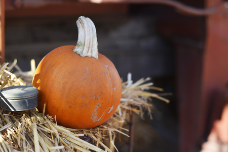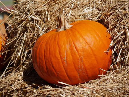 Pumpkin on a hay bale in the fall season.