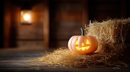 A glowing carved pumpkin resting on hay in a rustic barn setting, evoking the spirit of Halloween and autumn celebrations, perfect for seasonal decor.