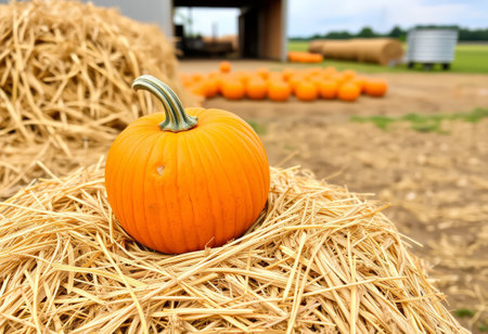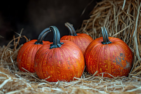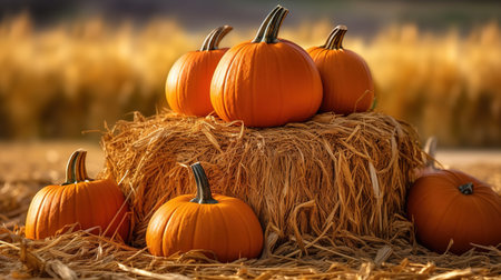 orange pumpkins on a haystack in a farm, created with generative ai