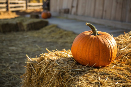 orange pumpkin resting on straw in farm with copy space
