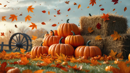Colorful autumn landscape featuring pumpkins, hay bales, and falling leaves at a rural farm during sunset