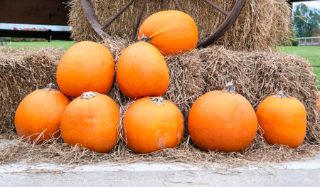 Pumpkins on Straw at a Rustic Farm Setting. Halloween Theme.