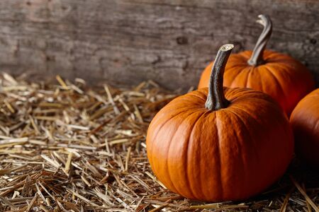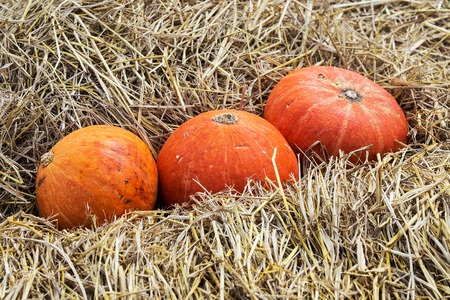 Autumn harvest of pumpkins on dry forage background