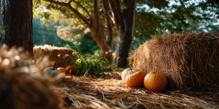 Hay bales and pumpkins rest on dry straw in sunlit forest clearing, creating warm and peaceful autumn scene