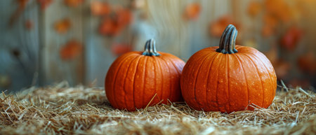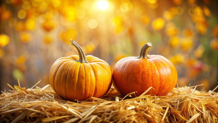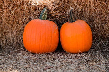 Two ripe pumpkins in straw autumn background