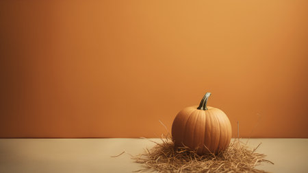 Pumpkin with straw on orange background. Minimal Halloween concept.