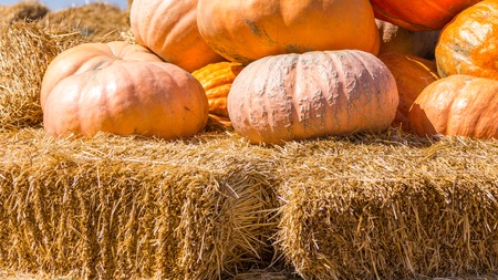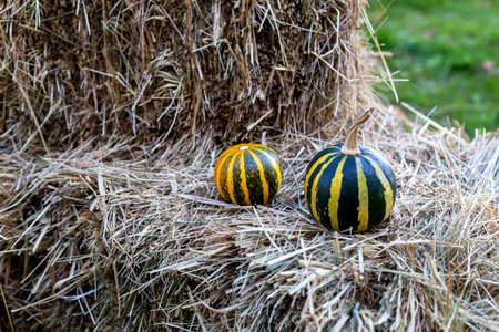 Halloween. Ripe small pumpkins lie on the hay