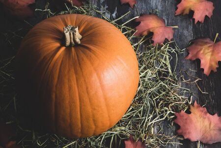 Big rural decorative orange pumpkin on rustic wooden background with rural hay and autumn foliage as festive holiday decor for thanksgiving or halloween.