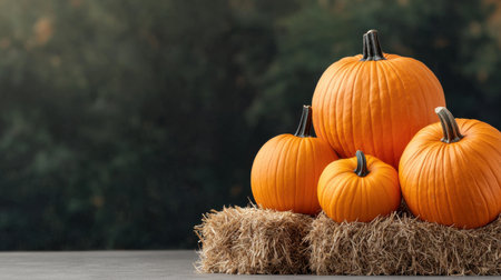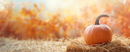 A large pumpkin sitting on a bale of hay with a soft-focus background. The right side of the poster offers a clean area for copy space.
