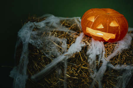Spooky Jack-o'-lantern with glowing faces and cobweb in dark. Pumpkin with scary carved face on hay with candle light, modern festive halloween street decor. Happy Halloween