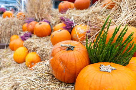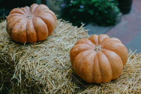 Pumpkins on hay bale, rustic festive decoration of european city street. Halloween street decor. Happy Thanksgiving and Halloween