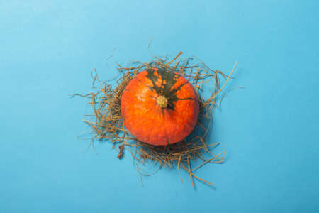 Pumpkin on a straw on a blue background. Harvest concept, Thanksgiving day, cook food, autumn. Flat lay, top view.