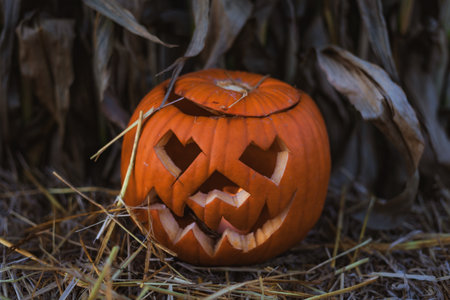 Halloween pumpkin decoration with hay