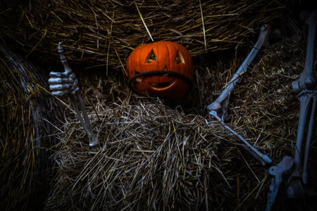 Halloween pumpkin on hay. Happy Halloween. Pumpkin harvest in autumn. Day of dead. Trick or treat. Celebrate All Hallows party holiday. All Hallows. October 31