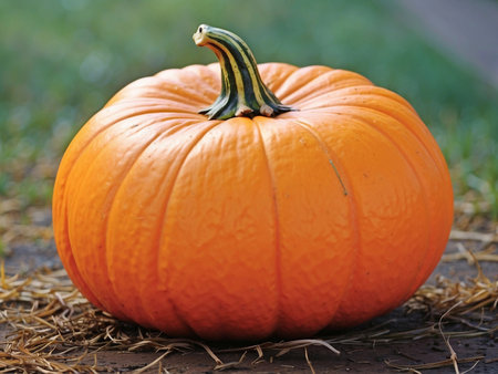 A closeup shot of a fresh pumpkin on dry grass