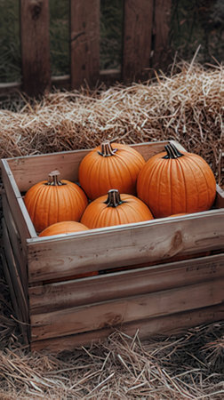 Pumpkins in a wooden crate on a hay bale.