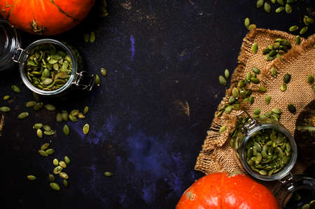 Healthy food, raw pumpkin seeds in glass jars and fresh pumpkins, dark background, top view