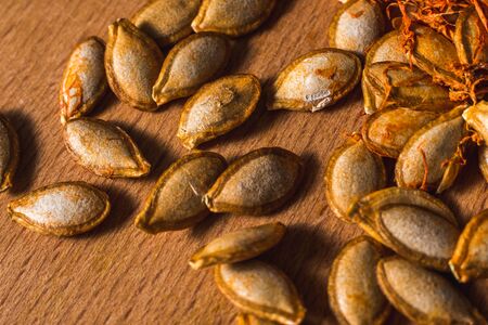 pumpkin seeds on a wooden table. quality photo