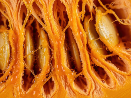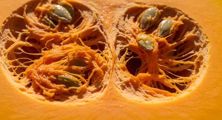 A detailed close-up of a pumpkin cut in half, revealing the intricate network of orange pulp and seeds inside. The vibrant colors and natural textures create a beautiful organic pattern. This image is perfect for themes of autumn, harvest, food, and nature's biology.