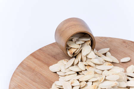 Pumpkin seeds with copy space over white background.