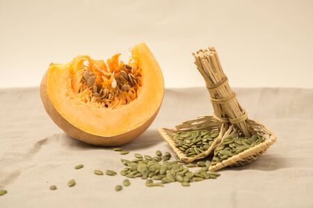 pumpkin seeds fall on orange pumpkin on walnut table with linen cloth with copy space