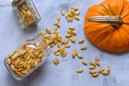 Two glass jars with roasted pumpkin seeds lying on a rustic table. A cut off top of a pumpkin is lying besides.