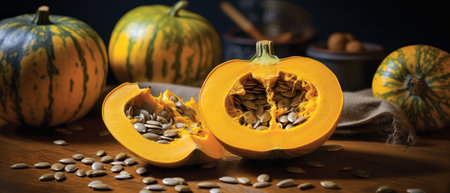 Organic acorn squash halved, seeds visible, autumn harvest theme,