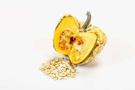 Ripe green pumpkin and seeds isolated on white background. Half squash, traditional decorative festive element for Halloween or Thanksgiving