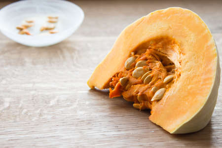 Close-up of a piece of orange pumpkin and seeds, indoors, wooden table