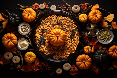 Halloween feast scene on black background. top-down view.