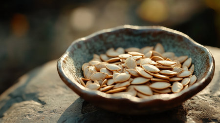Handful of pumpkin seeds resting in a small ceramic dish, with a soft focus on the seeds natural texture and warm, rustic tones.