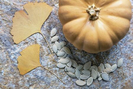 Autumn. Yellow leaves of ginkgo tree, pumpkin and pumpkin seeds. Natural stone background