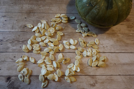 A pile of pumpkin seeds on a wooden table. The seeds are scattered in various sizes and shapes, creating a visually interesting and colorful scene. Concept of abundance and natural beauty