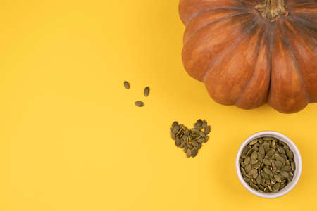 Orange pumpkin with pumpkin seeds flat lay on a yellow background. Scattered piled pumpkin seeds in a shape of a heart