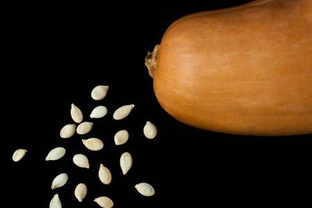 Pumpkin with seeds on a black background. Creative minimalism, dark and moody food photography. Copy space, squash top view, flat lay. Halloween concept.