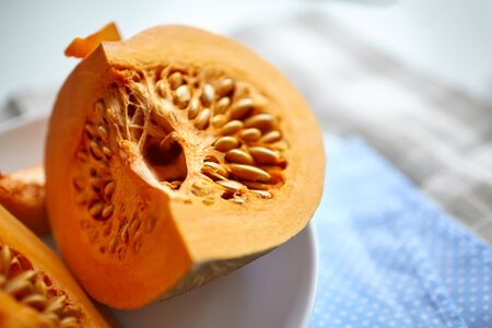 Pumpkin slices on a white plate on a table with blue napkin. Fresh pieces of pumpkin with seeds, vegetable ingredient, selective focus