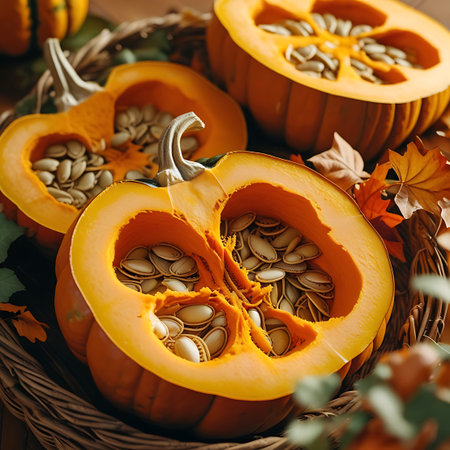 A close-up view of halved pumpkins filled with seeds, nestled in a wicker basket with scattered autumn leaves and a soft focus background.