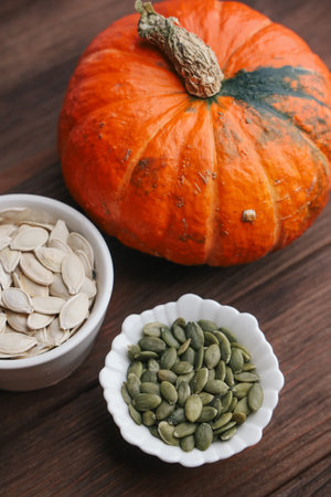 Bright orange pumpkin sits on a wooden table alongside bowls of pumpkin seeds and roasted pumpkin seeds. This setup highlights autumns bounty perfect for cooking and healthy snacks.