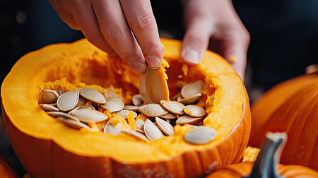 A close-up view of hands scooping seeds from a freshly cut pumpkin, showcasing the vibrant orange flesh and seeds, perfect for autumnal festivities and culinary creations.