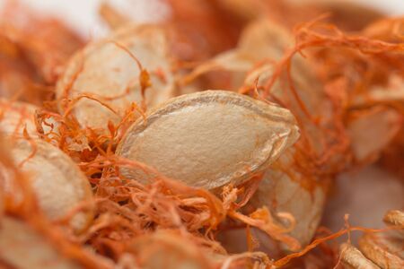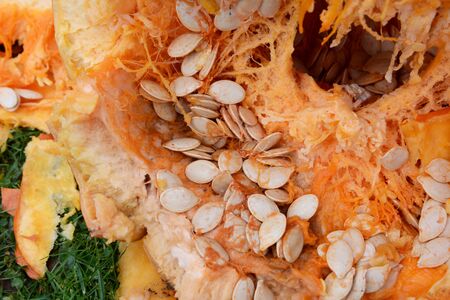 wet seeds of pumpkin, large pumpkin seeds that have just been removed from a cut pumpkin