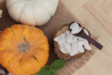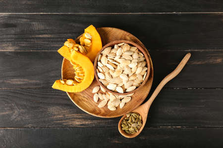 Pumpkin and pumpkin seeds on wood background close up