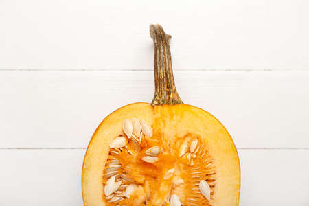 Half of ripe pumpkin on light wooden background, closeup