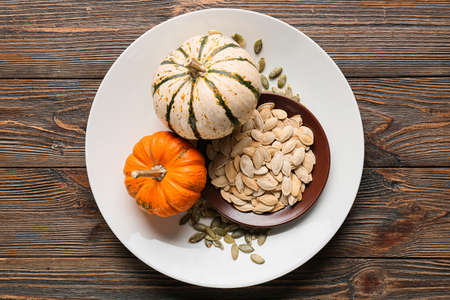 Plate with pumpkin seeds and fresh vegetables on wooden background