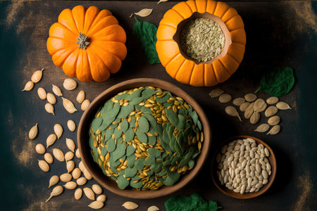 AI Generated. Fresh Pumpkin with Green Seeds in Wooden Bowl on Brown Background